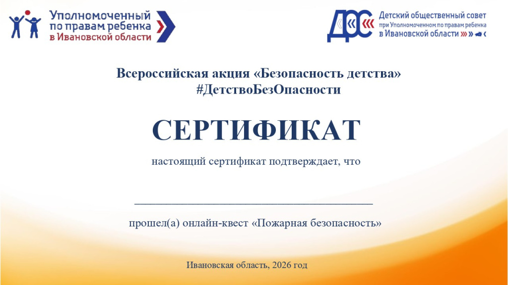 Сертификат онлайн-квеста "Пожарная безопасность".