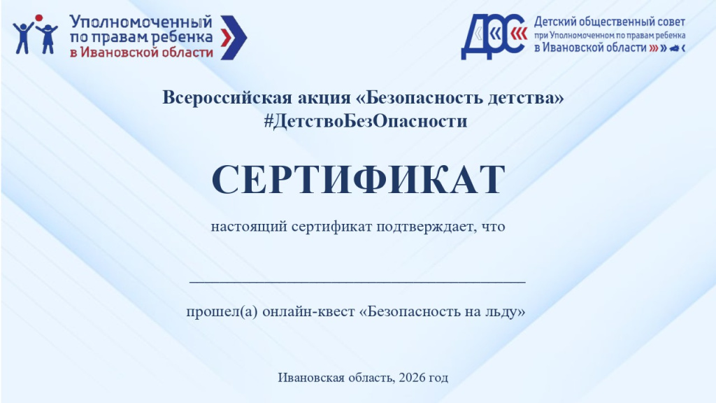 Сертификат онлайн-квеста "Безопасность на льду"