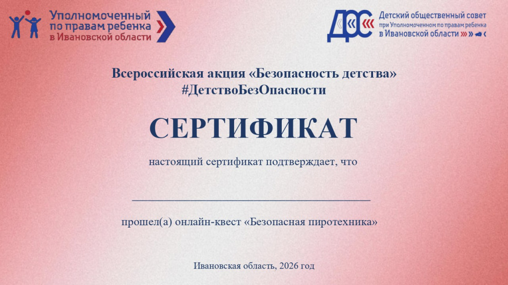 Сертификат онлайн-квеста "Безопасная пиротехника"